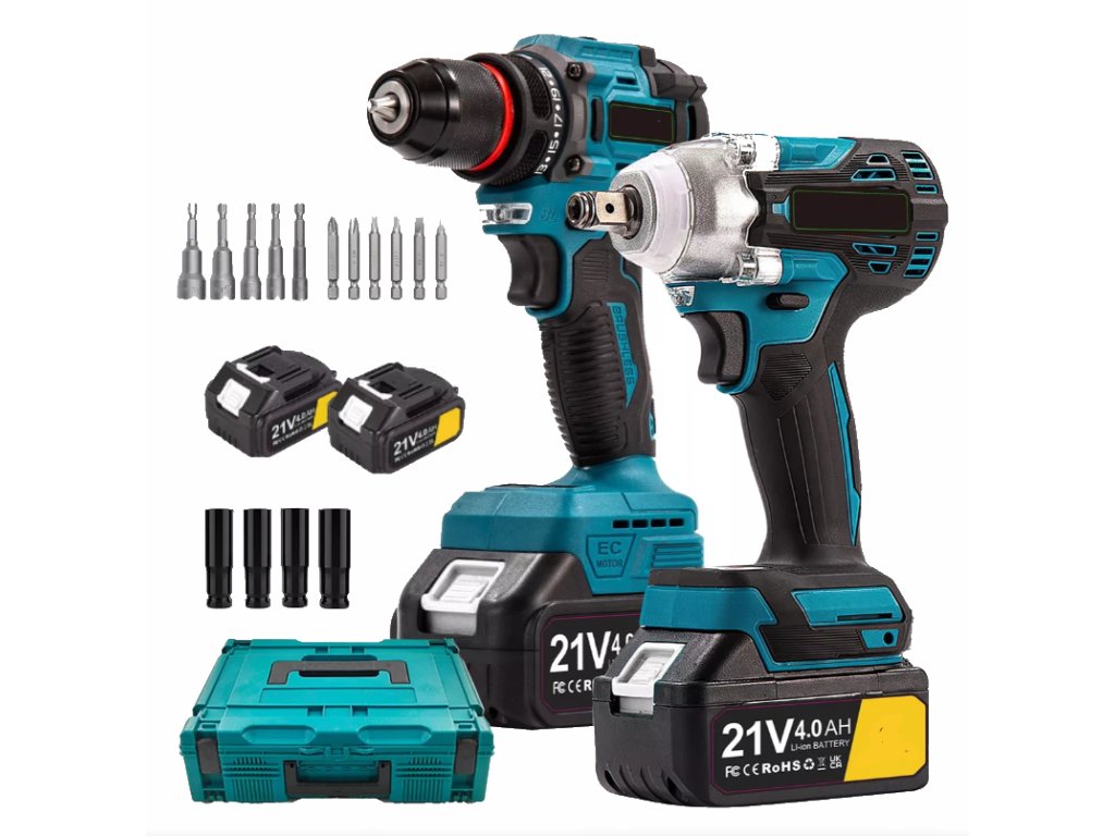 Sada aku nářadí – Rázový utahovák + Vrtačka s příklepem + 2× baterie 21V